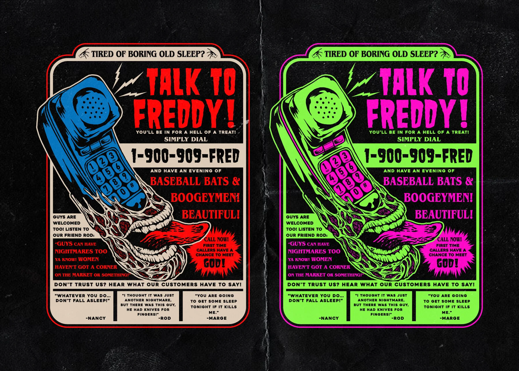 Zobie Productions commissioned this work to designed, and then printed on 600+ shirts to be shipped to the purchasers of their quarterly horror themed merchandise box. This was officially licensed artwork with the theme of “Nightmare on Elm Street”.